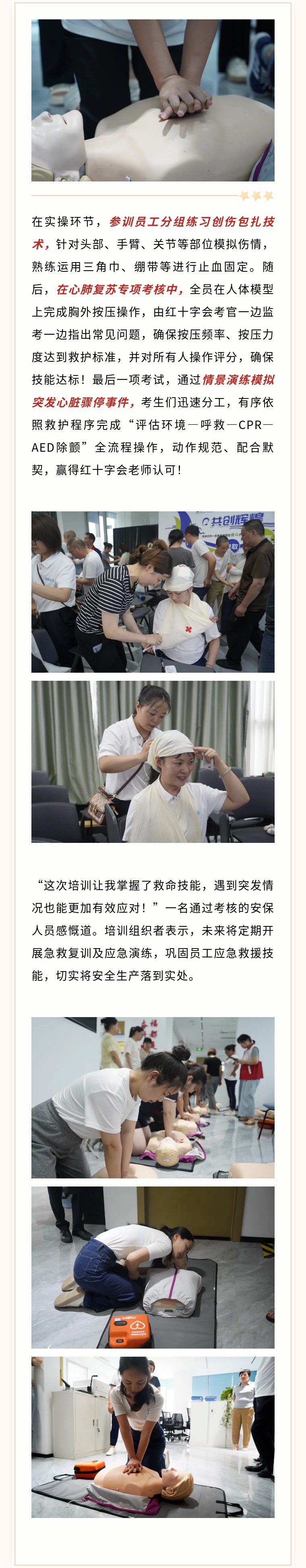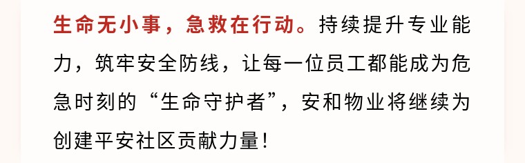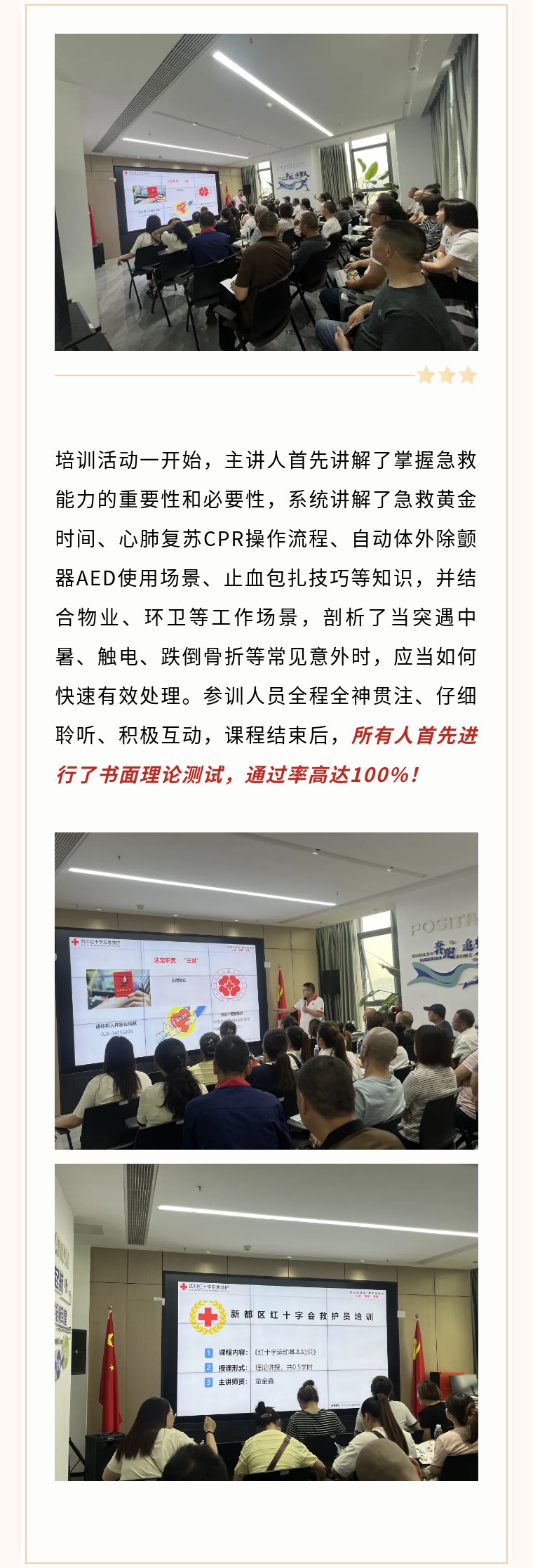 为深入宣传贯彻习近平总书记关于安全生产重要论述和重要指示批示精神,响应6月全国安全月“人人讲安全、个个会应急--查找身边安全隐患”主题号召,提升队伍安全救急专业能力,成都市安和物业服务有限责任公司联合新都区红十字会组织开展红十字救护员专项培训,本次培训涵盖心肺复苏(CPR)、自动体外除颤器(AED)使用、创伤包扎等急救核心技能,通过“理论+实操+考核”的全流程教学,助力员工成为专业的“安全响应第一人”,切实落实“个个会应急”要求,履行安全责任,守护居民安全。