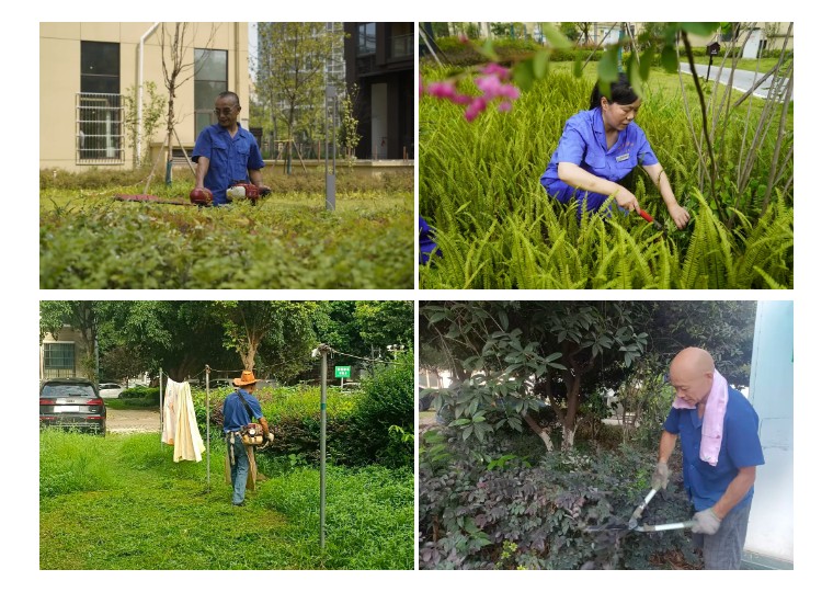 绿化工人手持修剪机,对园区草坪、灌木进行精细化修剪。高温下,草木散发出的热气混合着碎草屑,黏在皮肤上又痒又刺,但他们依然一丝不苟,确保每一处绿植整齐美观。同时,为清除疯长的杂草,保洁人员带上镰刀等工具,深入园区各角落做清除工作,避免杂草抢夺养分,破坏园区美景。