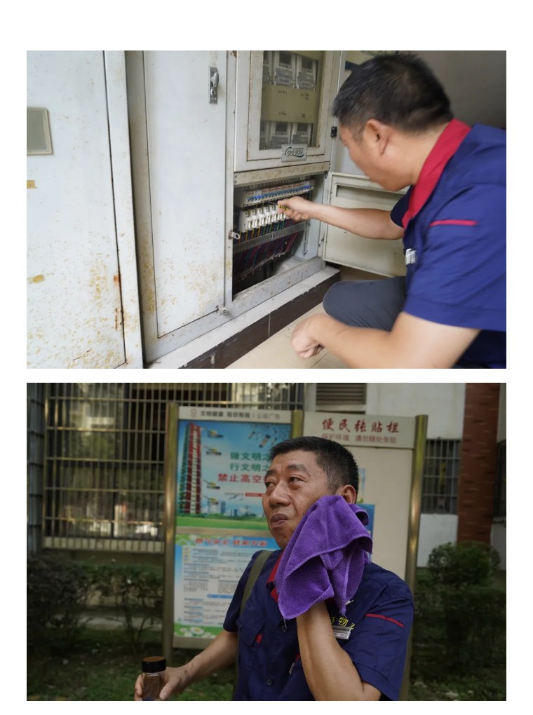 图丨二台子A区工程师傅检查完小区楼栋配电箱后正在擦汗