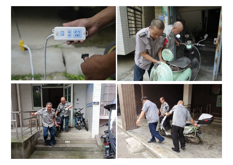 “您好,请把电动车停到集中充电桩!”秩序队员每天反复劝导违规停车的业主。他们顶着烈日整理乱停车辆,清理楼道内“飞线充电”现象,并时刻向来往业主进行安全宣贯。